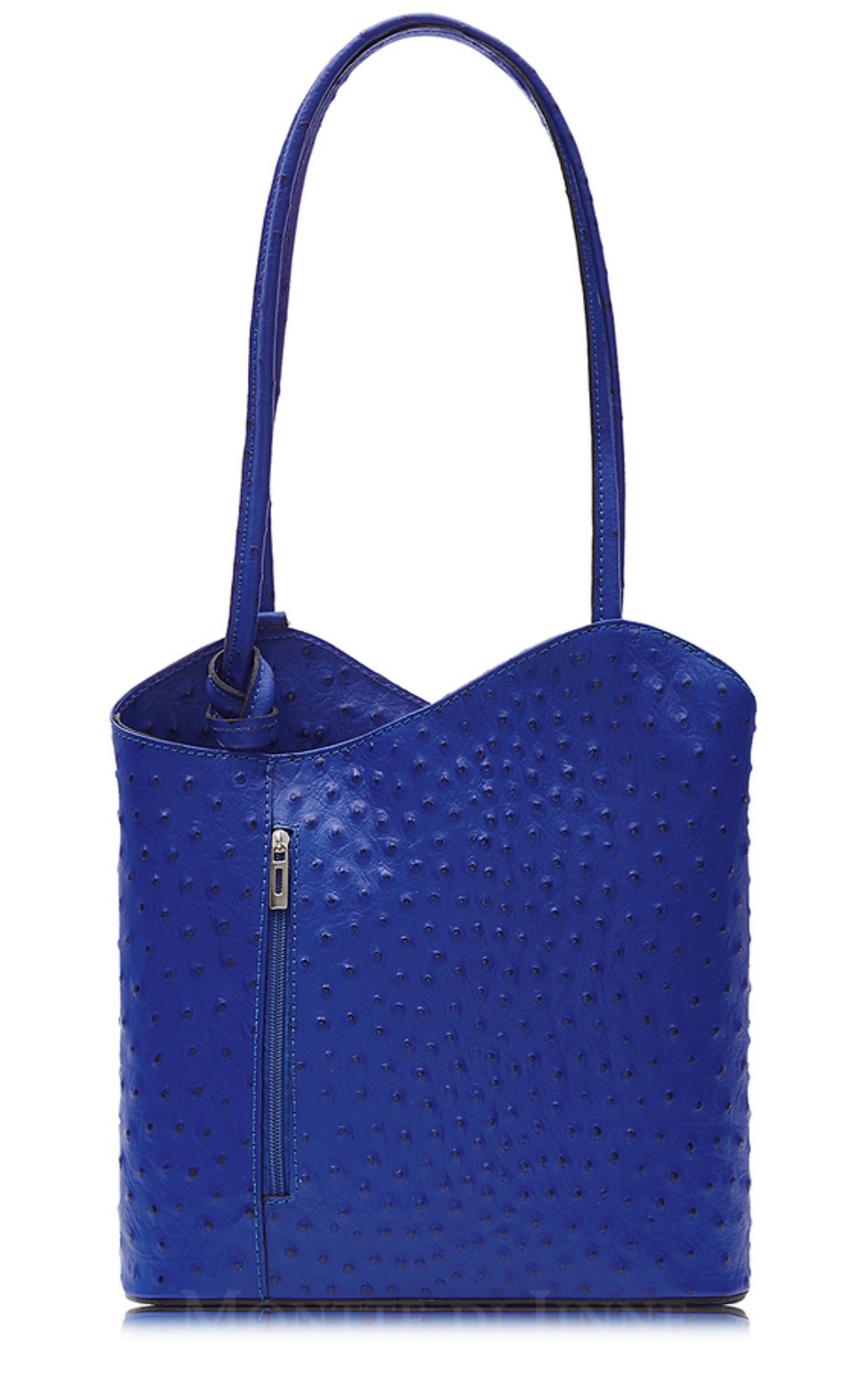 Classic Style with a raised effect leather. This bag can turn easily into hands free mode by pulling the two handles from behind making it a ruck sack. It has a centre compartment and inside zip pocket, the front and back zips are full sized useful for keys etc, this is a great practical everyday bag.